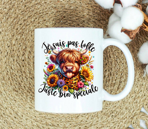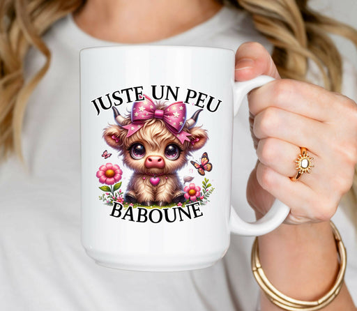 Tasse amusante avec une adorable vache Highland et la mention "Juste un peu baboune". Parfait pour égayer votre journée avec une touche de charme e...