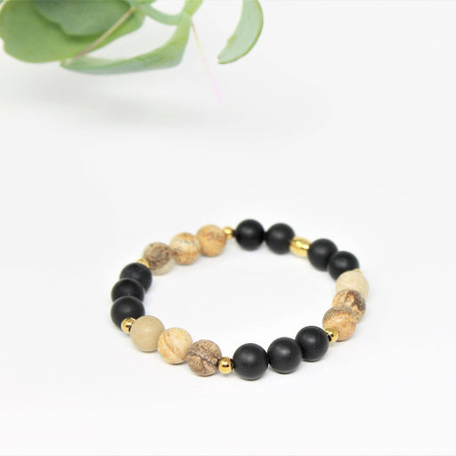 ⤐ MATÉRIAUX ET DESCRIPTION :• Pierres naturelles : Onyx et Jaspe paysage - Rond - 8mm • Fil élastique robuste sans latex • Billes en acier inoxyd...