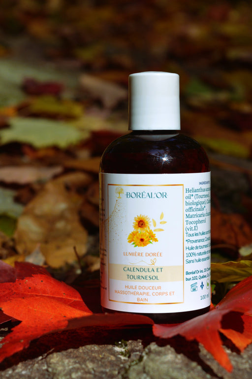 Boréal'Or inc.Tournesol, Calendula et Camomille. Huile massothérapie et hydratation, adaptée à toute la famille. Une merveilleuse huile adoucissante, hydratante,...