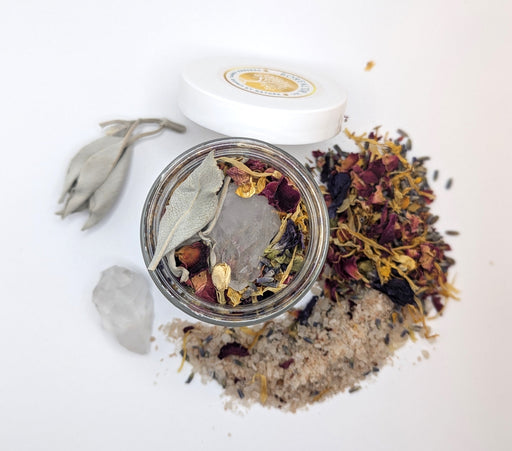 Boréal'Or inc.Trousse de départ avec mini Quartz clair et mini-tige de Sauge blanc.Un mélange entre sel et poudre de bain, ce sel de bain lunaire floral apaisant...