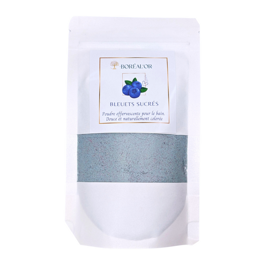 Marque et Produit créé et confectionné au Québec18.50$Poudre de bain effervescente- bleuets