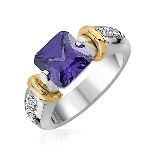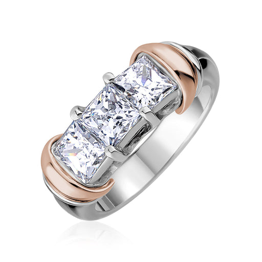 Baron Designs Inc.Magnifique bague - Trio de pierres coupe princesse, en argent sterling avec accent d'or 10 kt, jaune ou rose. Les épaules en or jaune ou rose de ch...