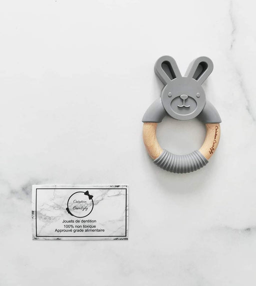 Création cocolyly inc.Lapin de silicone sur anneau de bois.