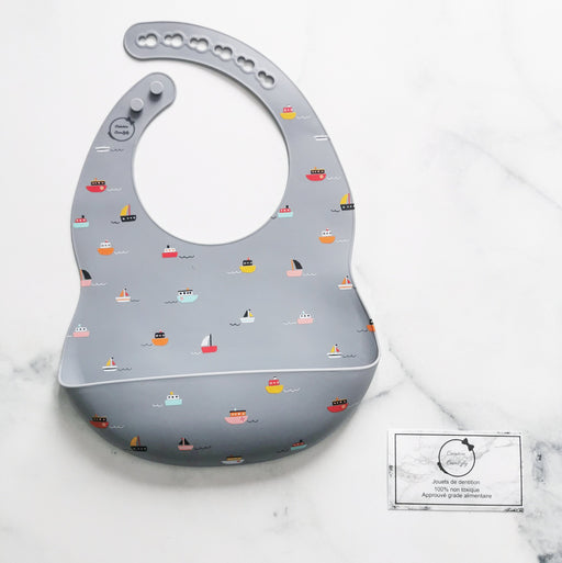 Marque et produit conçu au Québec et confectionné à l’étranger15.99$Bavette en silicone bateau
