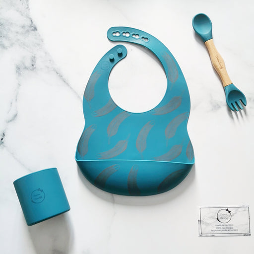 Marque et produit conçu au Québec et confectionné à l’étranger15.99$Bavette en silicone plume bleu océan