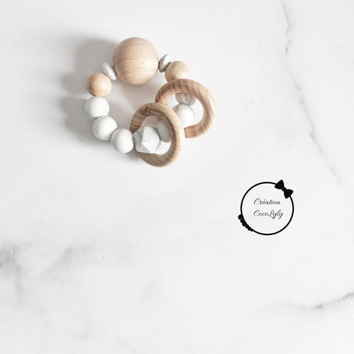 Création cocolyly inc.Petit jouet parfait. Quand bébé le secoue les anneaux de bois fond du bruit pour l'amusé.