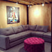 Sectionnel 2 côtés monté sur structure de bois-franc avec coussins de dos en plume et dacron.