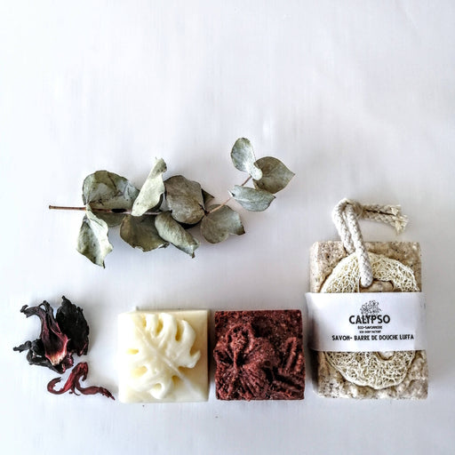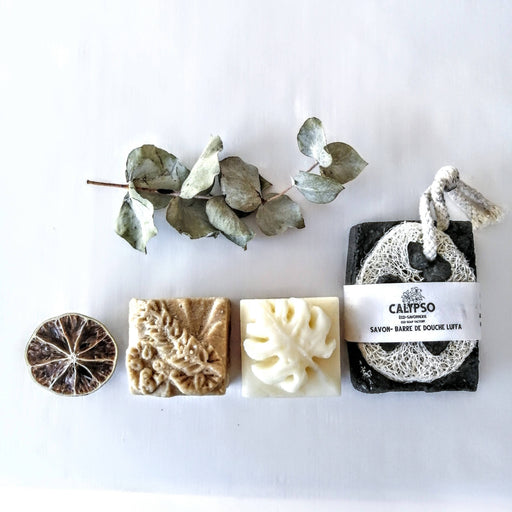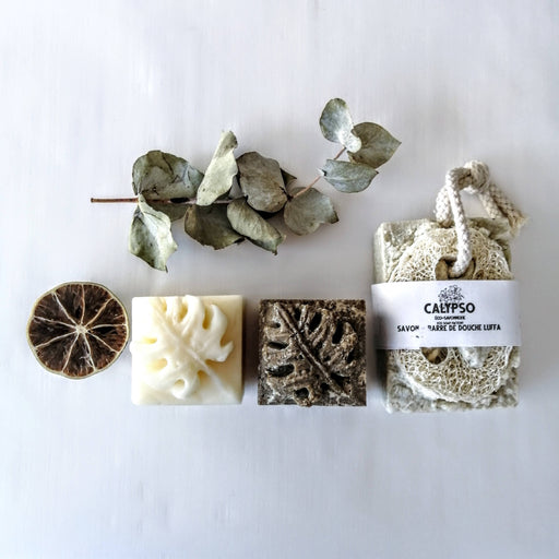 Calypso Éco-savonnerieZéro Déchet - Zero wasteLe coffret inclus : savon-barre de douche LUFFA, shampoing et revitalisant solides_______Savon avec éponge LUFFA - Barre de...