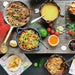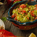 Servir la garniture principale, les tortillas et la garniture secondaire avec les deux salsas. Garnir les tortillas d’une cuillère à soupe de viande, de garniture et de salsa.