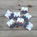 Boucles d'oreilles faites de pastilles de bois avec motifs géométriques de couleur.