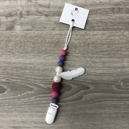 Marque et Produit créé et confectionné au Québec16.00$Attache-suce plume, lilas, fushia et perle