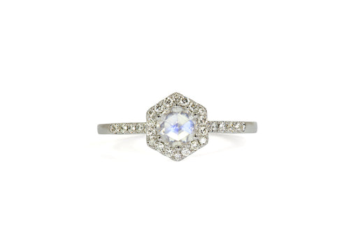 Flamme en roseLes particularités de ce bijou Bague de fiançailles semi-éternité avec une pierre de lune montée sur griffes comme pierre centrale. La pierre de lu...