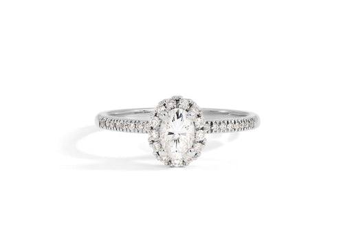 Flamme en roseLes particularités de ce bijou Bague de fiançailles ou pour simplement dire «Je t'aime». Le diamant central est de coupe ovale entouré d'un halo. ...