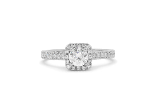 Flamme en roseLes particularités de ce bijou Bague de fiançailles semi-éternité. Halo de 16 diamants autour d'un diamant d'un demi carat monté sur griffes. Corps...