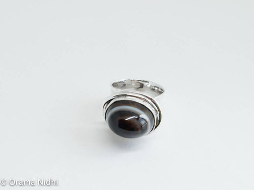 Orama NidhiCette bague en argent 925 est sertie d'une pierre d'agate «oeil de shiva». L'agate présente un jeu de cercles concentriques de couleurs noire, brun...