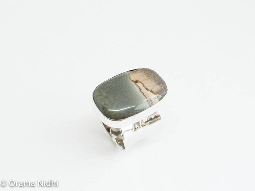 Orama NidhiCette bague en argent 925 est sertie d'une pierre d'agate. L'agate présente un jeu de couleurs dans les tons de brun, beige et vert. Conçue par la...