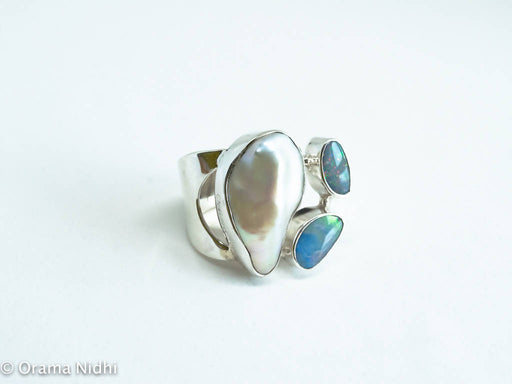 Orama NidhiBague en argent 925, sertie de deux pierres d'opale australienne et d'une perle baroque.Conçue par la designer montréalaise Carole Morand, la bague...