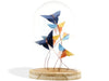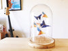 Cloche décorative contenant un modèle d'origami (l'art japonais du pliage de papier) - ici six papillons pliés dans un papier cartonné bleu et à motif coloré. Réalisée à la main, cette cloche est prête à être posée sur une étagère, une table ou un bureau pour venir compléter n'importe quel décor! C'est un objet unique et original à offrir en cadeau ou pour se gâter.