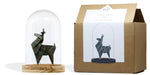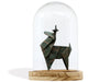 Cloche décorative contenant un modèle d'origami (l'art japonais du pliage de papier) - ici un renne plié dans un papier à motif vert profond avec des lignes couleur terracota. Réalisée à la main, cette cloche est prête à être posée sur une étagère, une table ou un bureau pour venir compléter n'importe quel décor! C'est un objet unique et original à offrir en cadeau ou pour se gâter.