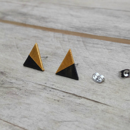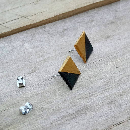 Marque et Produit créé et confectionné au Québec25.00$Boucles d'oreilles en bois du québec (merisier) et acier inoxydable- triangles noir et or