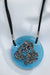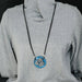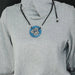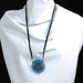 De la collection Classique, un bijou contemporain, pendentif rond, bleu turquoise transparent avec des touches de gris, très sobre mais essentiel dans un coffre à bijoux.