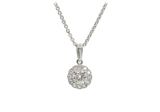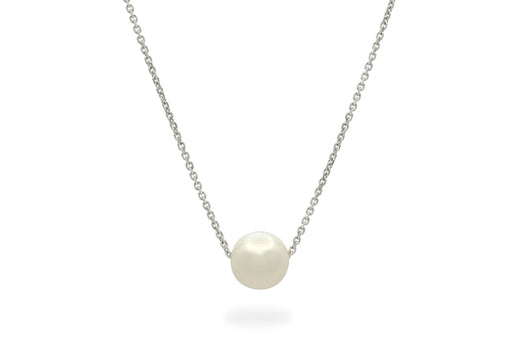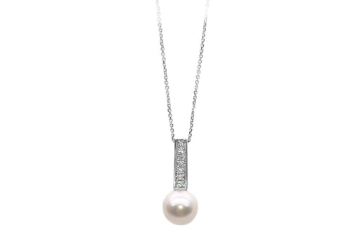 Flamme en roseLes particularités de ce bijou Un pendentif qui réuni deux classiques, la perle et le diamant. Une perle d'eau douce naturelle blanche de 8 mm enjo...