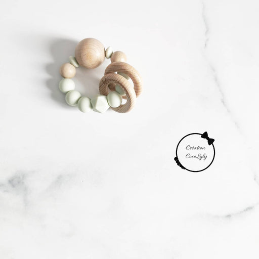 Création cocolyly inc.Petit jouet parfait. Quand bébé le secoue les anneaux de bois fond du bruit pour l'amusé.