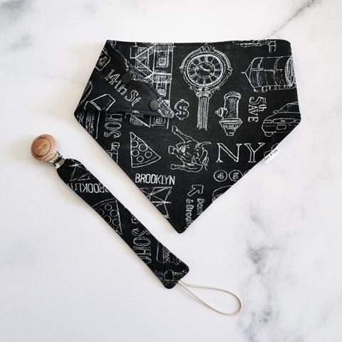 Marque et Produit créé et confectionné au QuébecPrix d'origine $29.99Prix actuel 15.99$Duo bavoir et attache suce ny