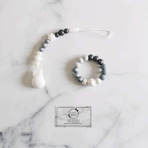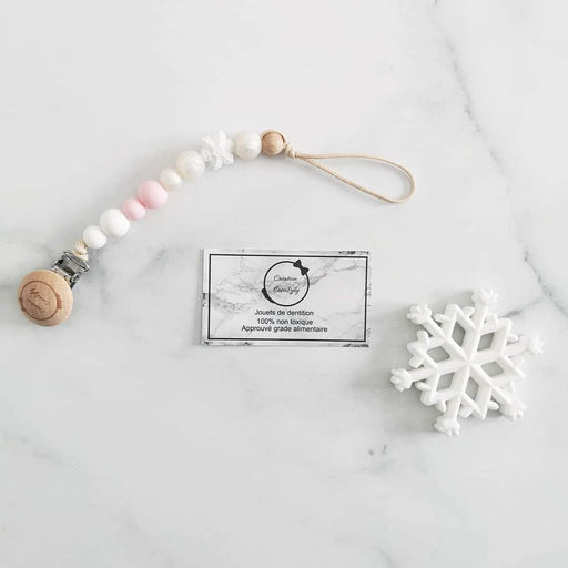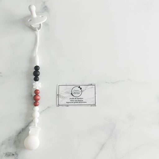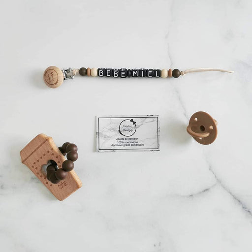 Création cocolyly inc.Attache suce avec jouet de dentition en bois personnalisable