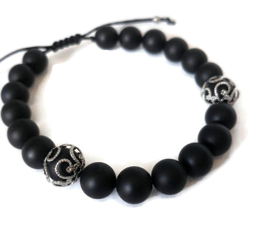 Bijoux Le fil d'ArianeBracelet fait de billes d'agate noires, dépolies. Le bracelet est monté sur une corde de nylon, il est donc résistant, et ajustable, puisque le fer...