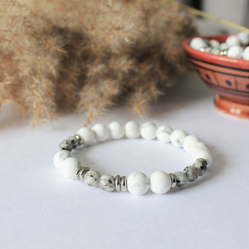My Wooden LifestyleDescription⤐ MATÉRIAUX ET DESCRIPTION :• Pierres naturelles : Howlite - Rond - 8mm• Fil élastique robuste sans latex• Billes et breloque Plume en a...