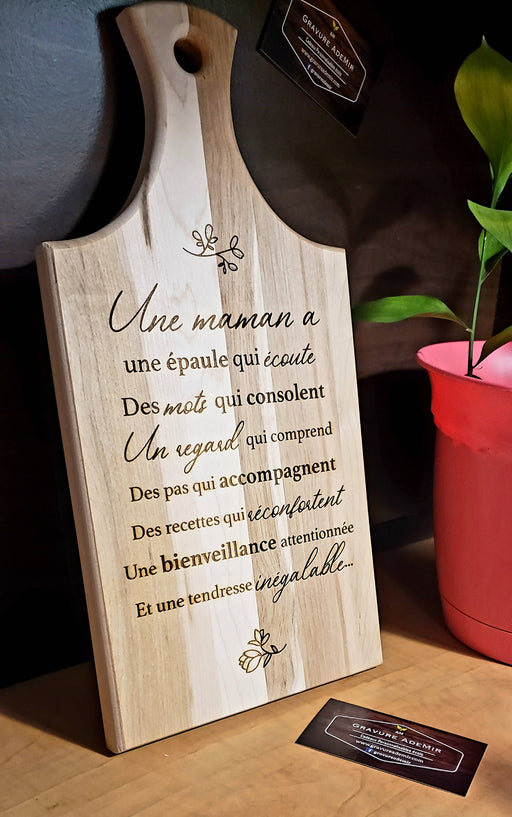 Gravure AdeMirPlanche à découper en bois merisier de qualité Nos planches sont prises chez notre fournisseur Québécois Forme : rectangle avec une manche pour acc...