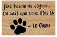 Tapis d'entrée extérieure humoristique, illustrant un petit mémo. '' PAS BESOIN DE COGNER... ON SAIT QUE VOUS ÊTES LÀ ... LE CHIEN ''. En plus d'être original, il est très pratique pour garder la maison propre.
