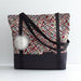 Grand sac urbain (tote bag) de création originale en tissu à motif chevron de couleurs vibrante avec bijoux décoratif, conçu pour vous accompagner toute la journée au travail, à la garderie ou au 5 à 7!