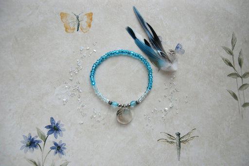 L’enjoliveuseBracelet fabriqué à la mainMontage de perles blanches et bleuesBreloque unique en résine avec insertion de pétale de rose bleueGrandeur médium (16 ...