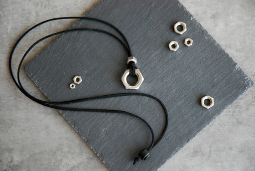 L’enjoliveuseCollier fabriqué à la mainLacet de cuir brun et écrou en acier inoxydableGrandeur médium: 40 à 46,5 cm (16 à 18 1/2 pouces)