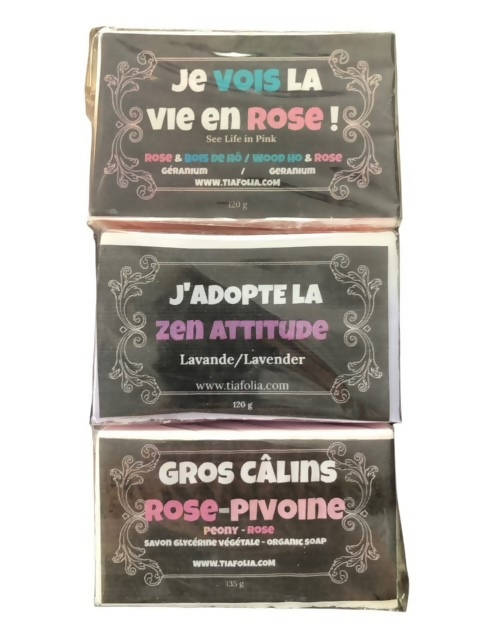 TiafoliaSavon en trio : Rose et géranium , Lavande et Rose-Pivoine 115 g chacunGlycérine végétale