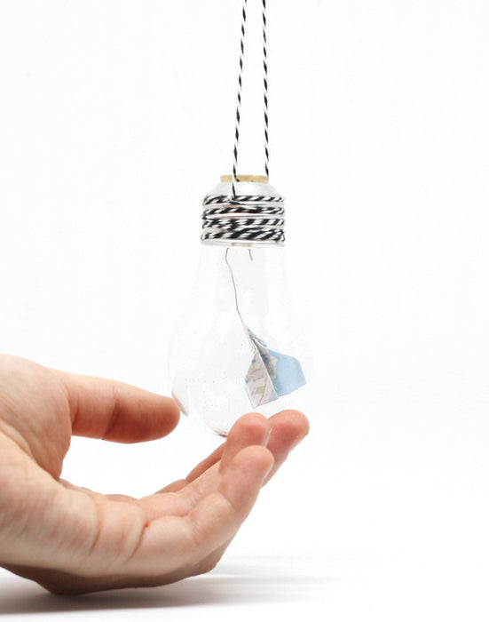 Une ampoule décorative contenant des pliages d'origami (l'art japonais du pliage de papier) - ici un avion plié dans un morceau de la carte géographique de Montréal. Réalisée à la main, cette ampoule est prête à être suspendue dans n'importe quel décor! C'est un objet unique et idéal à offrir en cadeau ou pour se gâter!