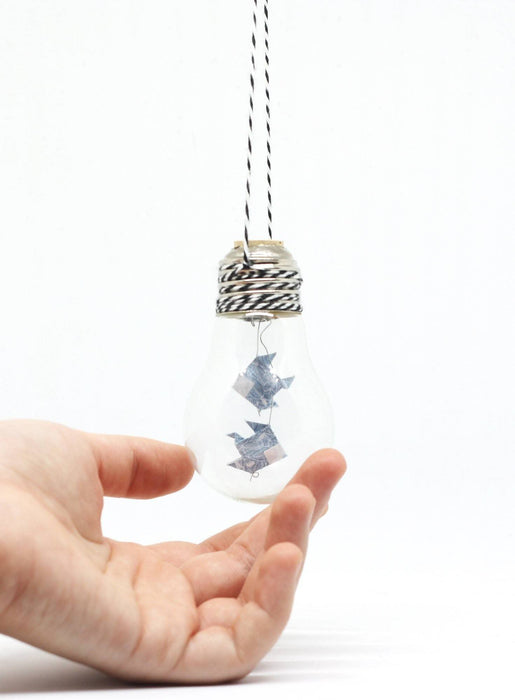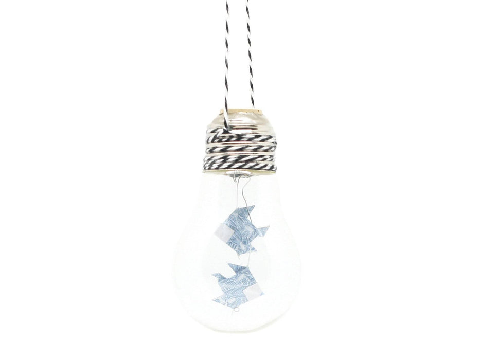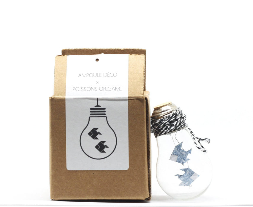 Une ampoule décorative contenant des pliages d'origami (l'art japonais du pliage de papier) - ici deux poissons pliés dans un papier à motif bleuté. Réalisée à la main, cette ampoule est prête à être suspendue dans n'importe quel décor! C'est un objet unique et idéal à offrir en cadeau ou pour se gâter!