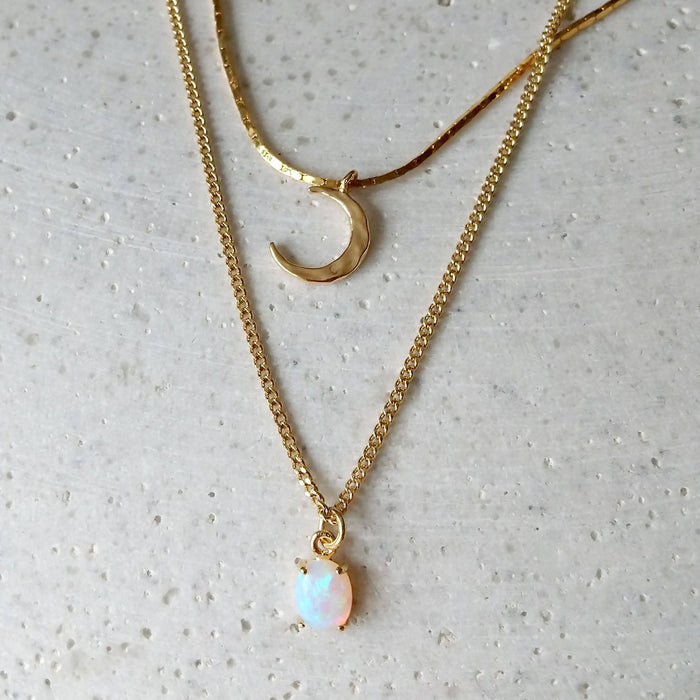 • Superbe ensemble de deux colliers composé d'un croissant de Lune martelé et d'un cabochon de verre Harlequin rose opale. Étant donné la nature vintage des cabochons, la couleur varie de l'un à l'autre mais tous sont sublimes. Laiton plaqué à l'or fin. Avec anneaux à ressorts comme fermoirs.