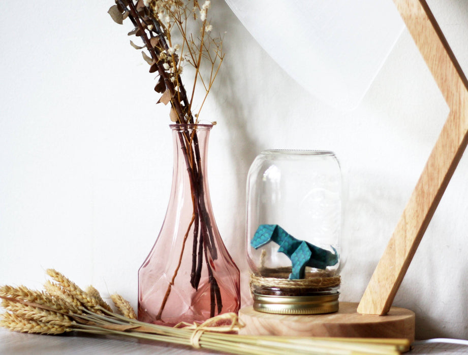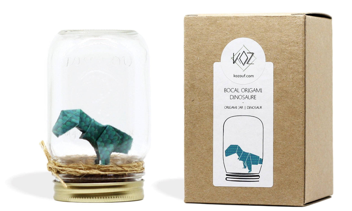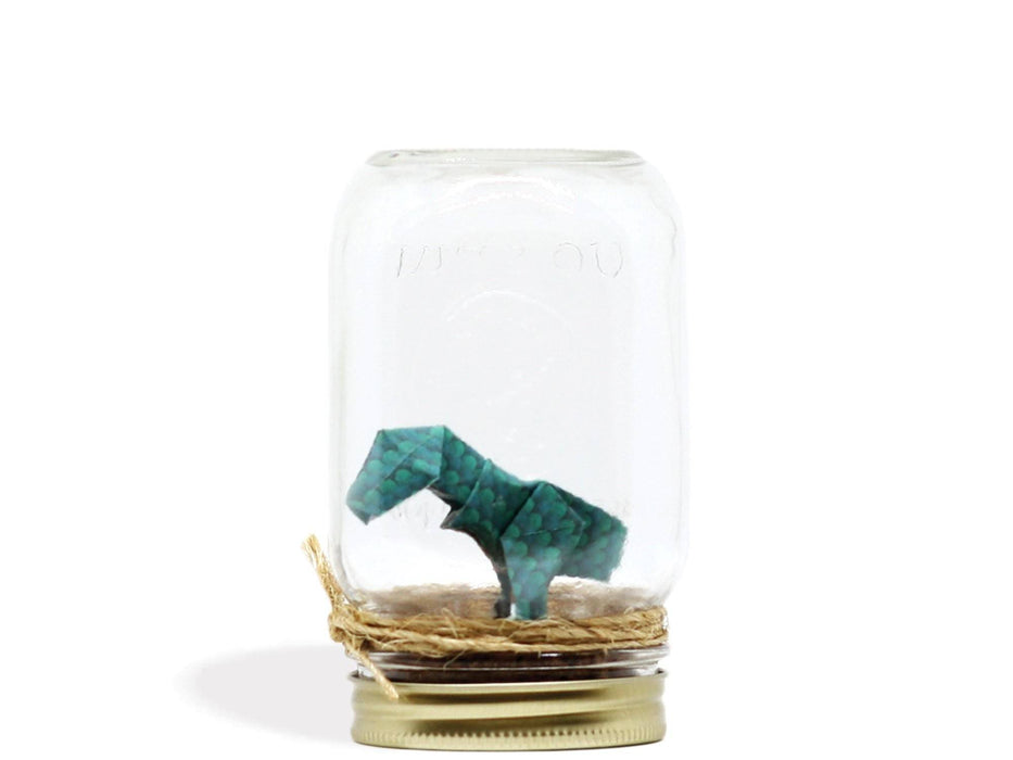 Pot mason décoratif contenant des pliages d'origami (l'art japonais du pliage de papier) - ici un dinosaure plié dans un papier à motif vert avec des écailles. Réalisé à la main, ce bocal est prêt à venir décorer toute étagère, table ou bureau! C'est un objet unique et original à offrir en cadeau ou pour se gâter!