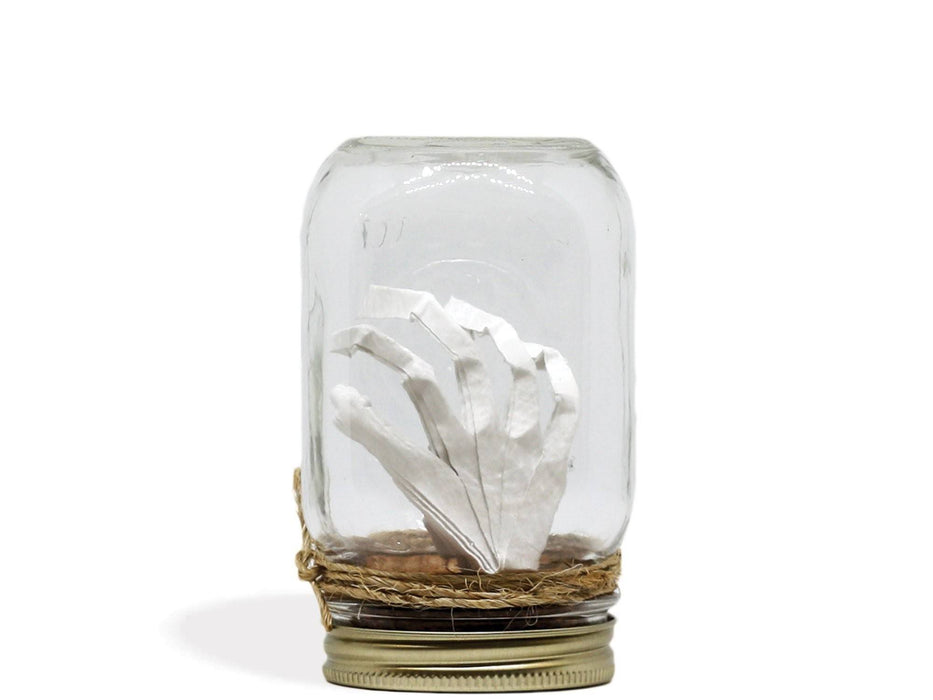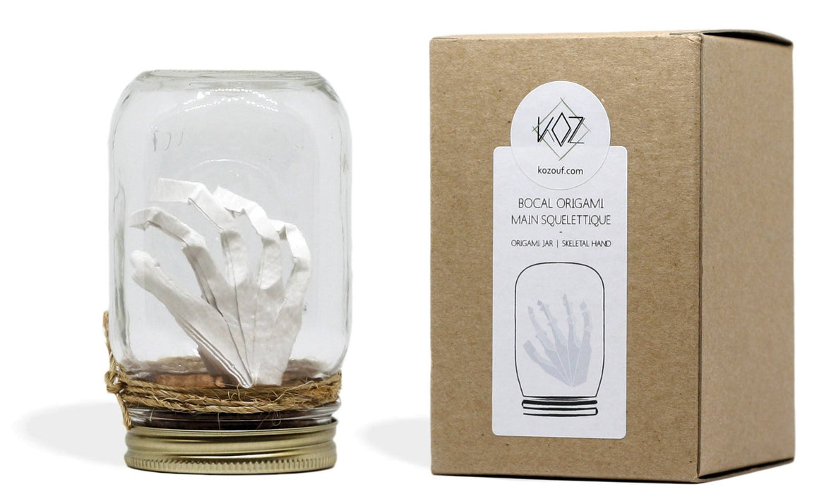 Pot mason décoratif contenant des pliages d'origami (l'art japonais du pliage de papier) - ici une main de squelette pliée dans du papier blanc. Réalisé à la main, ce bocal est prêt à venir décorer toute étagère, table ou bureau! C'est un objet unique et original à offrir en cadeau ou pour se gâter!