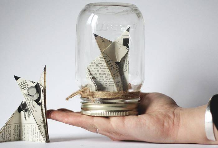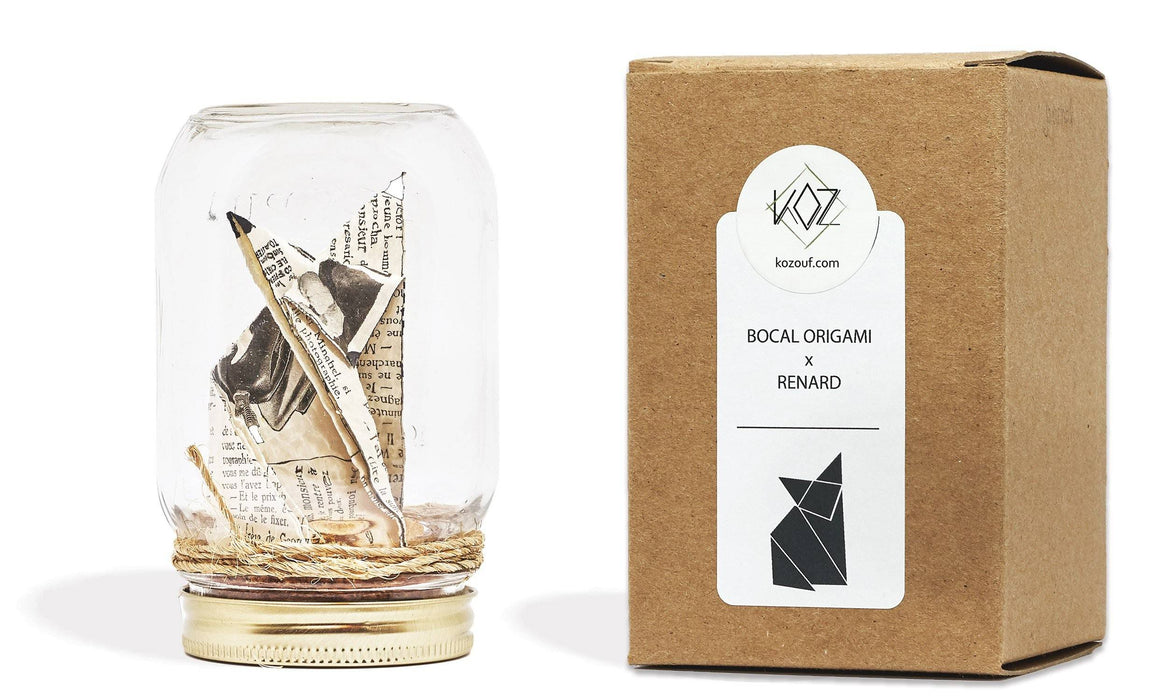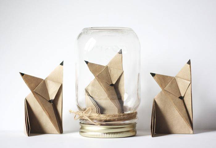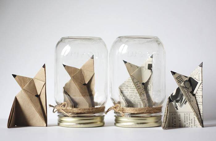 Pot mason décoratif contenant des pliages d'origami (l'art japonais du pliage de papier) - ici un renard plié soit dans du papier kraft, soit dans du papier journal. Réalisé à la main, ce bocal est prêt à venir décorer toute étagère, table ou bureau! C'est un objet unique et original à offrir en cadeau ou pour se gâter!
