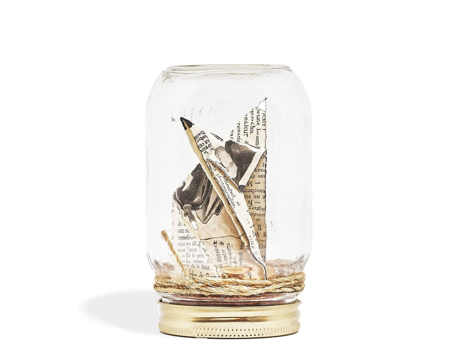 - Matériaux: Pot Mason 500 mL, Papier Kraft ou Journal, Fil métallique, Liège, Corde en sisal.