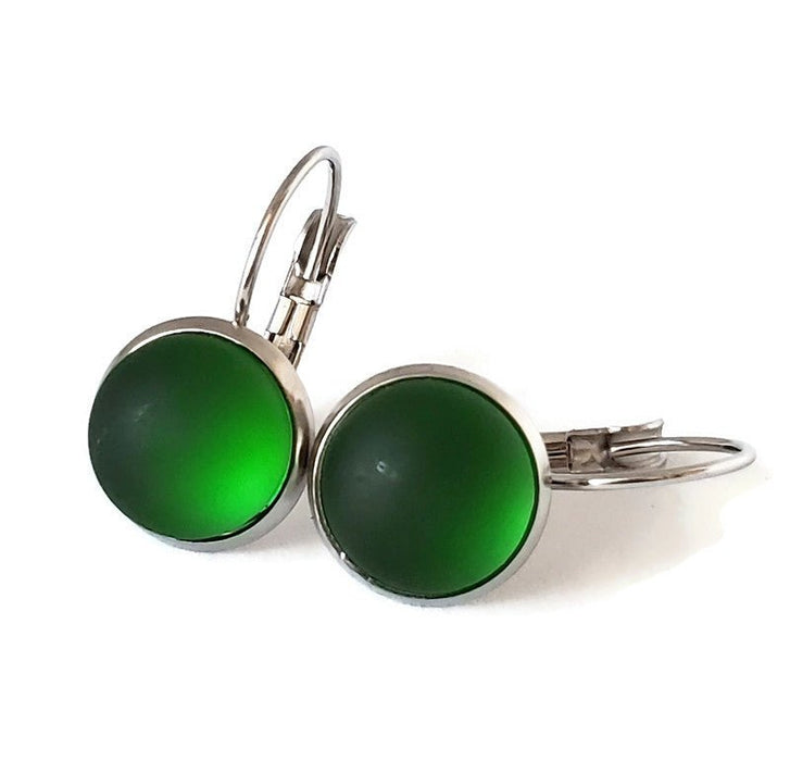 • Jolie paire de boucles d'oreilles, qui se referment derrière l'oreille avec le système de levier! De couleur vert  elles ont été crées à partir du verre d'une bouteille de vin vide! Je taille, assemble et fais fondre le verre  à 1600 degrés pour créer les pièces de verre! Elles sont ensuite été dépolies pour leur donner et effet velouté, semblable au verre flotté par la mer!