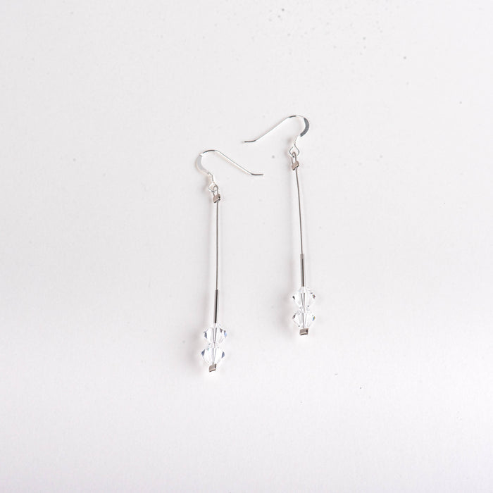 Ces gracieuses boucles d'oreilles en métal flexible, munies de crochets en argent, sont garnies d’étincelant cristal Swarovski (6 x 6 mm) et de tubes de rhodium (un matériau qui ne ternit pas).