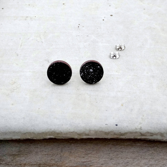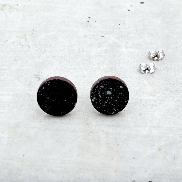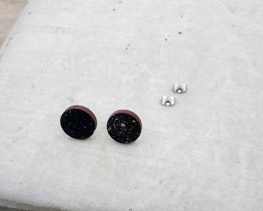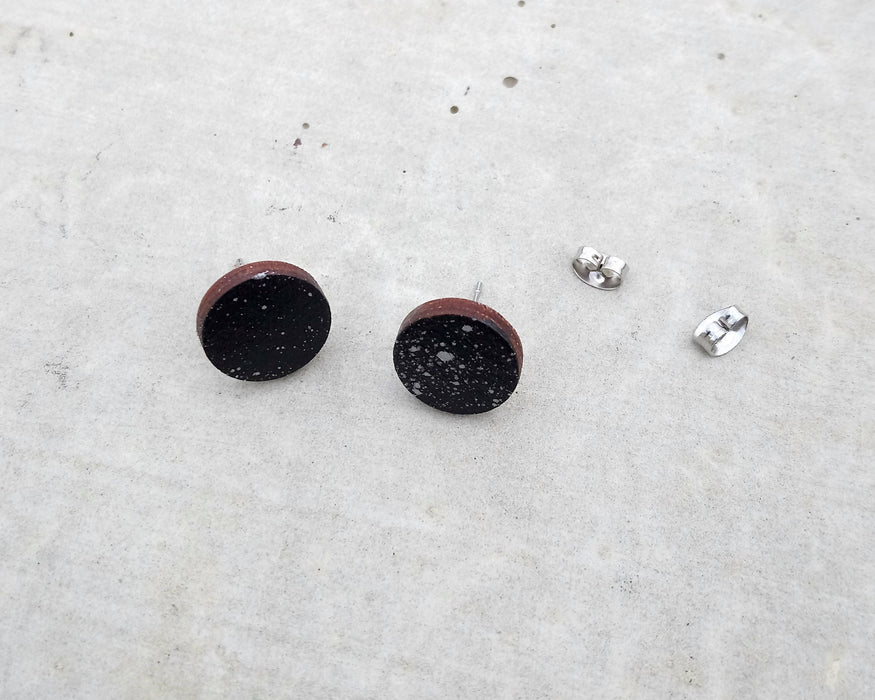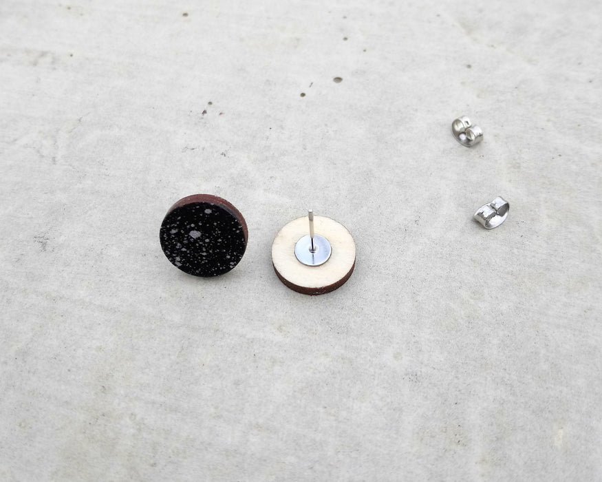 Boucles d'oreilles noir et argent en bois du québec (merisier) et acier inoxydable, art abstrait éclaboussures