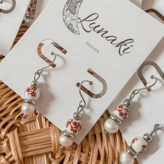 Boucles d'oreilles pendantes et délicates avec perle d'eau douce, bille de céramique avec fleurs rouges et acier inoxydable