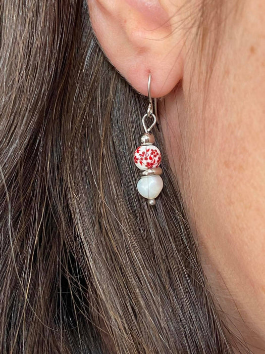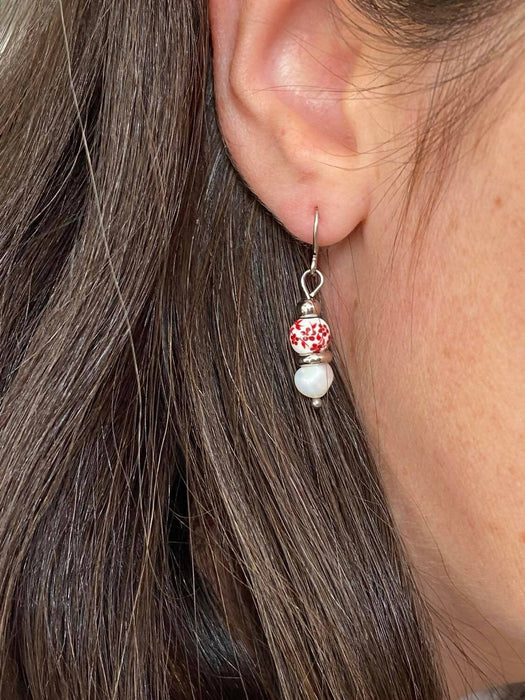 - Boucles d'oreilles délicates fabriquées à la main à partir de perle d’eau douce naturelle, billes de céramique avec des petites fleurs rouges et bourgogne et d'acier inoxydable.• Longueur du pendant : 3 cm