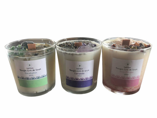 3 bougies d'intention avec pierres semi-précieuses et pétales de fleurs